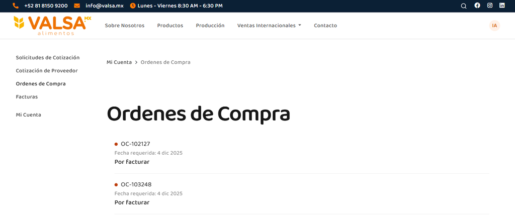 Para ver el listado de órdenes da clic en la opción Ordenes de Compra que se encuentra en la lista de opciones del lado izquierdo.
