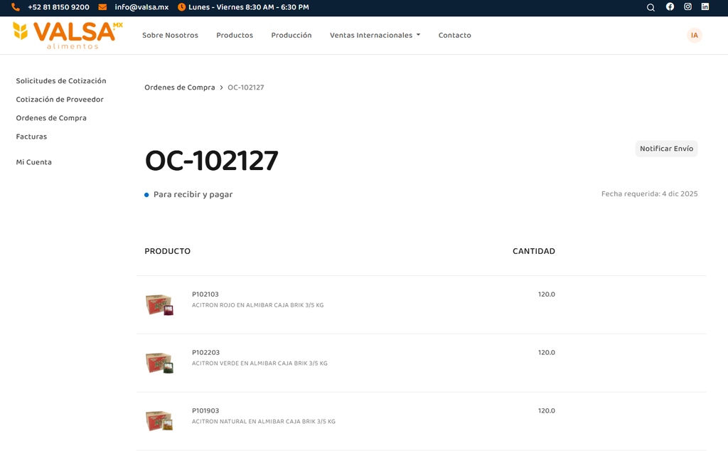 * Si ya has generado una notificación de envío para esta orden, del lado derecho verás el botón "Ver Notificación de Envío". Donde podrás ver qué productos, cantidades y lotes enviarás además de subir la factura y/o certificados de calidad que tengas pendiente por subir.